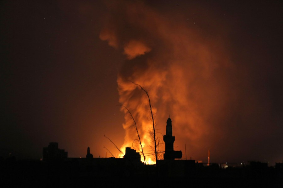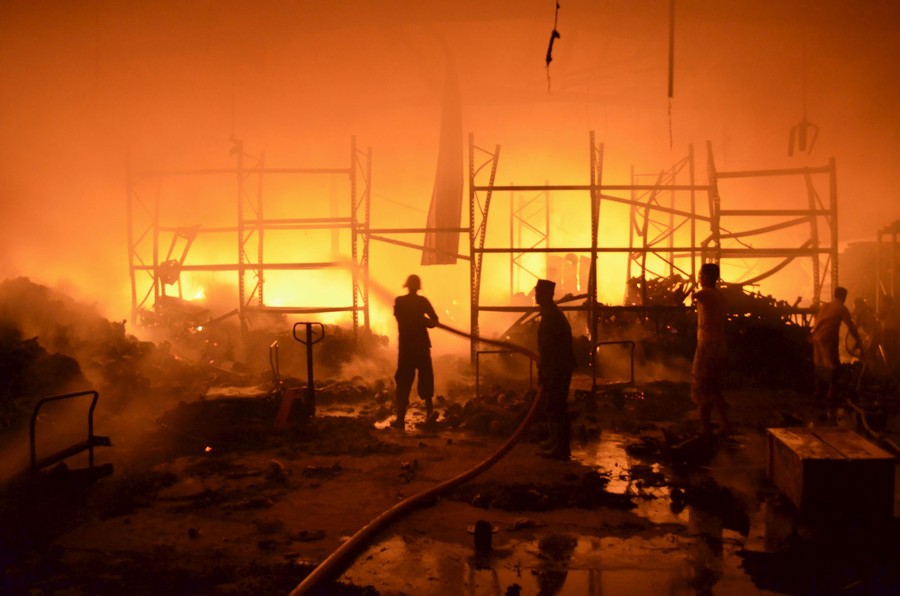 Read moreFirefighters attempt to extinguish a fire at a foodstuff storage facility destroyed by a Saudi-led air strike in Yemen's Red Sea port city of Houdieda on January 6, 2016. #