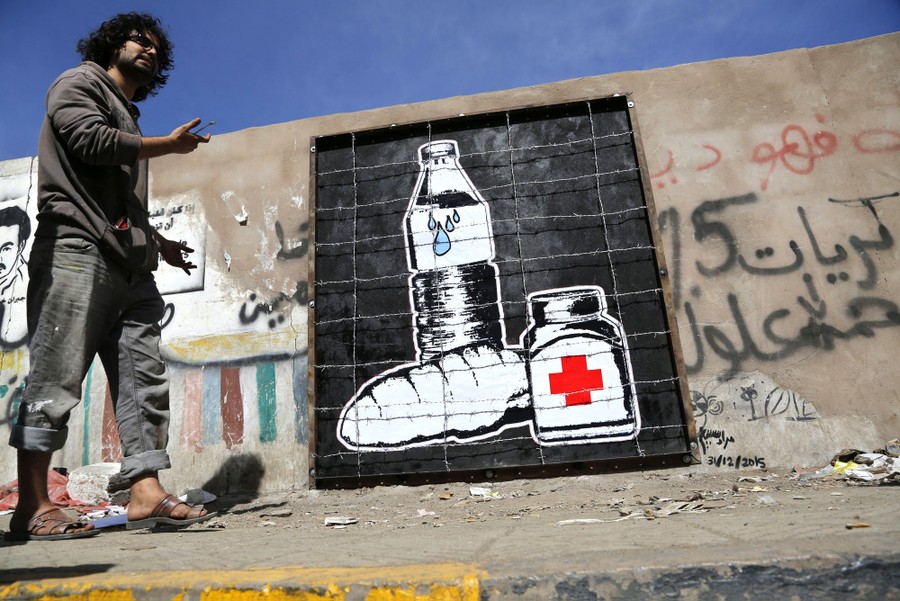 Read moreYemeni artist Murad Subai installs a graffiti project on a wall protesting a Saudi-led blockade imposed on Yemen, in Sanaa, on December 31, 2015. Saudi Arabia has imposed a blockade on the impoverished nation since March 2015, as part of its ongoing campaign against the Houthis. #