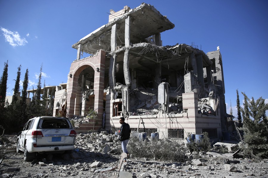 Read moreA man stands on a poster of Yemeni President Abed Rabbo Mansour Hadi among the wreckage of a municipal building destroyed by a Saudi-led air strike in Yemen's capital Sanaa, on January 3, 2016. #