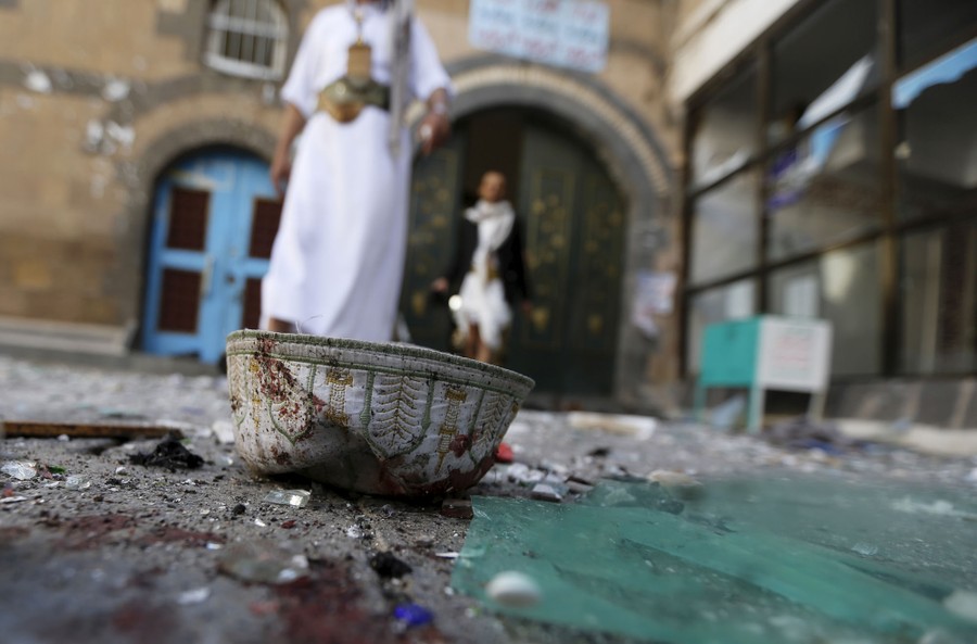 Read morePeople walk past headgear lying on the ground at the al-Balili mosque after two bombings at the mosque in Sanaa on September 24, 2015. Two suicide bombers blew themselves up at a mosque run by Yemen's Houthi group in the capital Sanaa on the first day of the Muslim Eid al-Adha holiday, causing many casualties, witnesses said. #