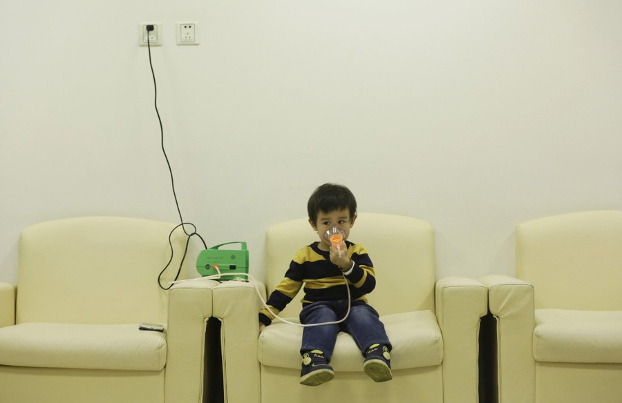 Read moreThree-year-old Hanhan receives nebulizer therapy on the third day after China's capital Beijing issued its second ever “red alert” for air pollution, at the New Century International Children’s Hospital, in Beijing, on December 21, 2015. #