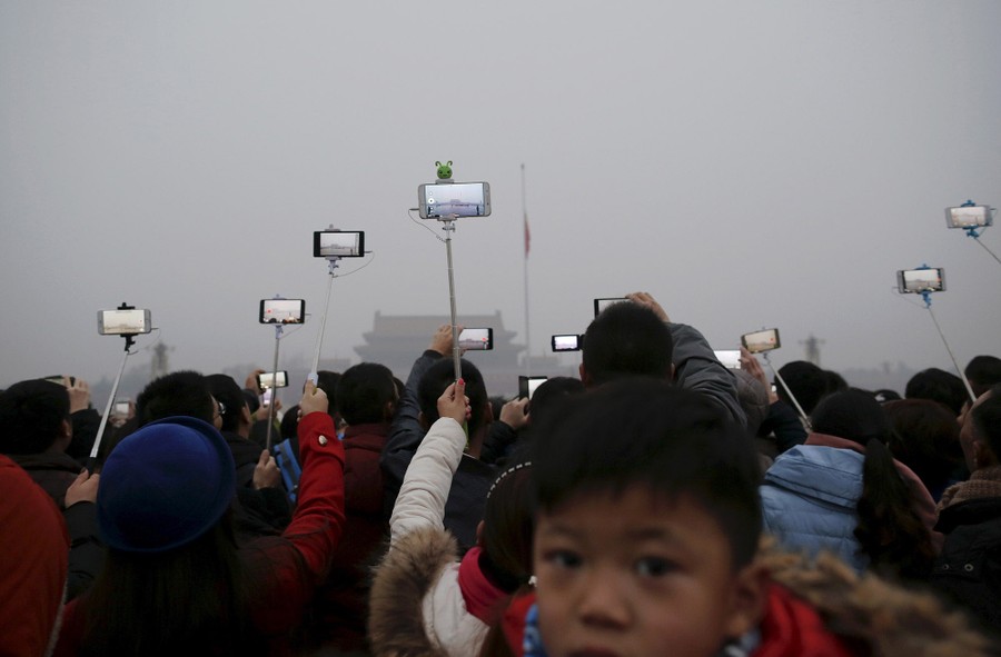 Read morePeople take photos and videos during a flag-raising ceremony amid heavy smog at Tiananmen Square, after the city issued its first ever “red alert” for air pollution, in Beijing, on December 9, 2015. #