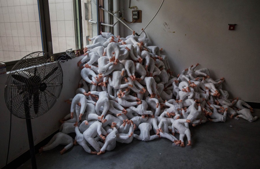 Read moreStuffed bodies of plastic dolls are piled up at a toy factory on September 17, 2015, in Xietang, Zhejiang province. Many of the toy factories in the area have seen a sharp decrease in orders from Europe and Latin America in 2015, with many people citing a decline in Russia's currency and inflation in South America as the main reasons for the decrease. #