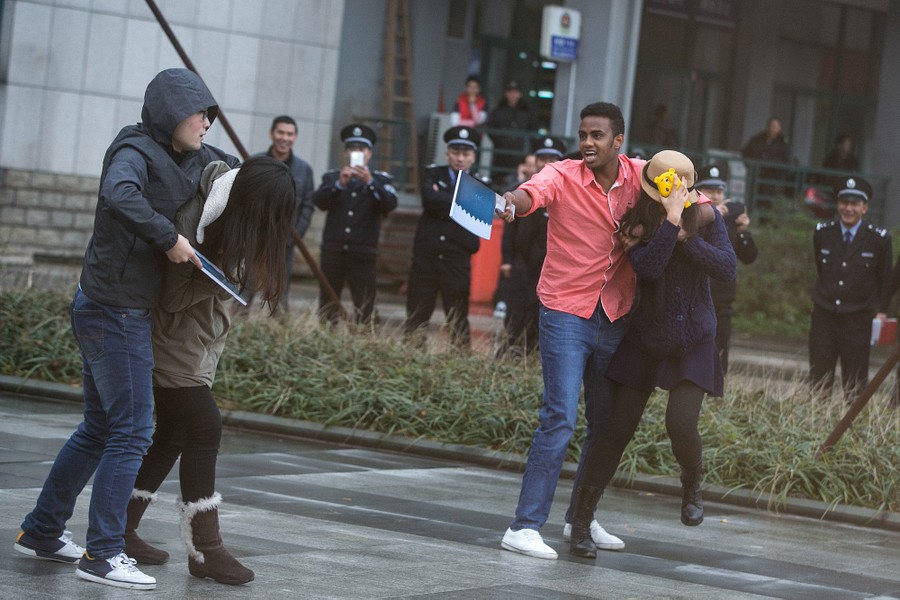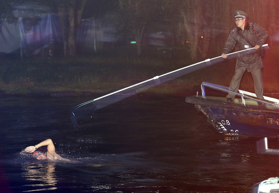 Read moreA security officer tries to stop a man from swimming away after being caught swimming in West Lake, which is a violation of the resort's regulations, in Hangzhou, Zhejiang province, on December 1, 2015. #