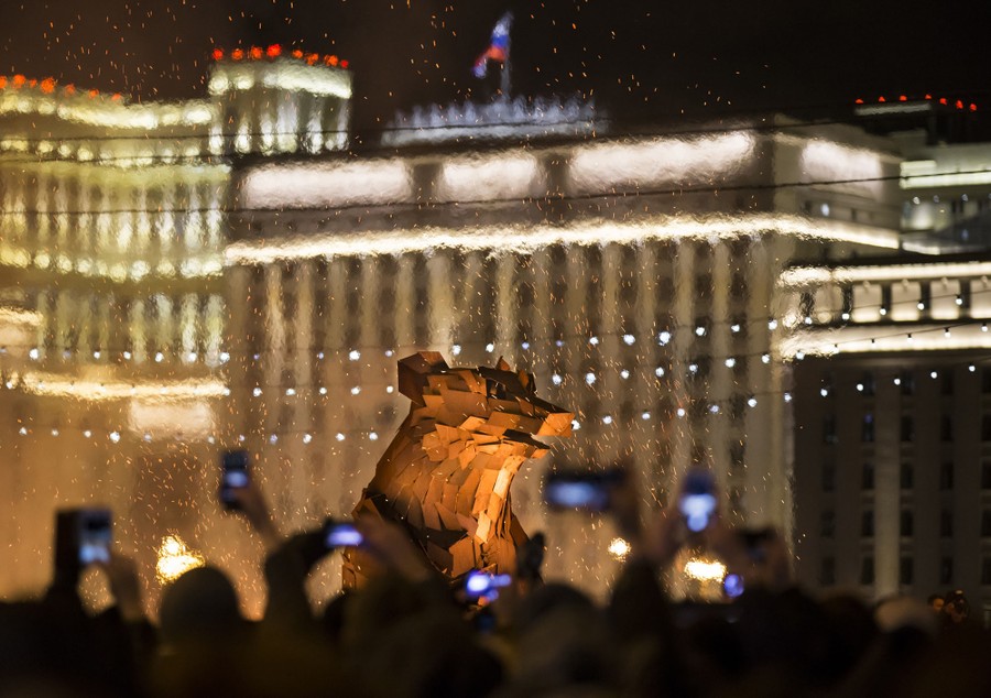 Read morePeople take pictures of the burning symbol of spring, which looks like a brown bear emerging from his den. The bear was created by Hungarian artist Gabor Miklós Szoke for the festival in Gorky Park during a celebration of Maslenitsa, or Shrovetide in Moscow, Russia, on March 13, 2016, with the building of the National Defense Center of Russian Defense Ministry in the background. #