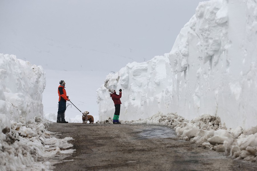Read moreA couple walks their dog and take pictures on a road after heavy snowfall between Las Machorras and the ski resort of Lunada, near Espinosa de los Monteros, in the northern province of Burgos, Spain, on March 13, 2016. #