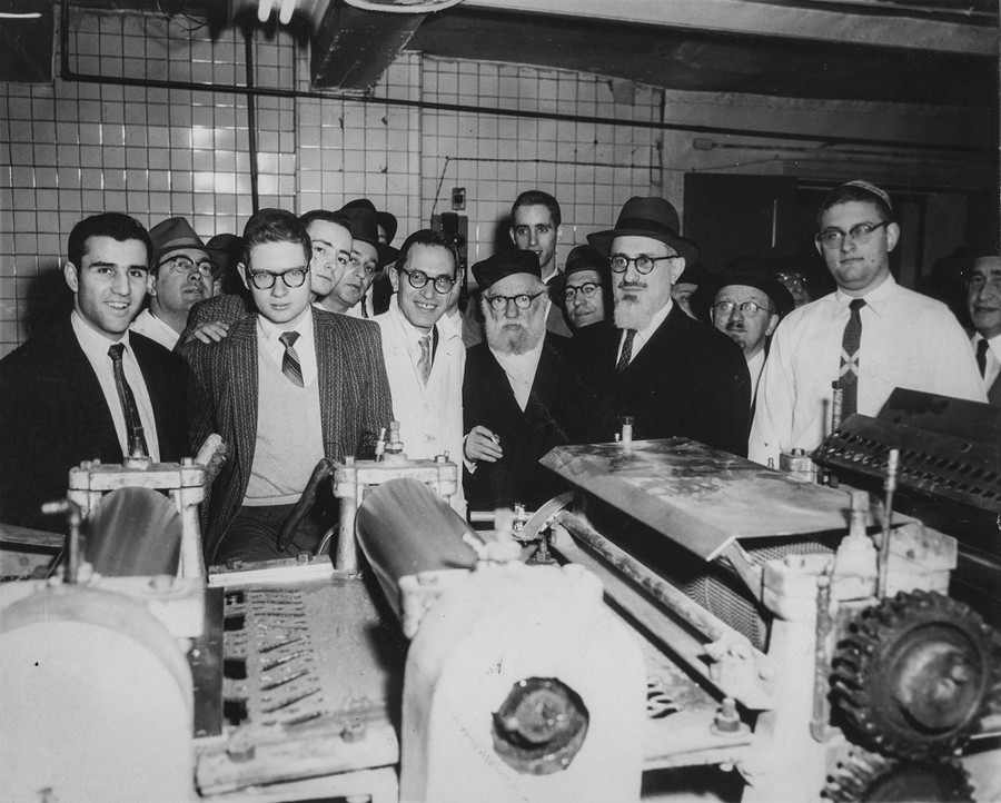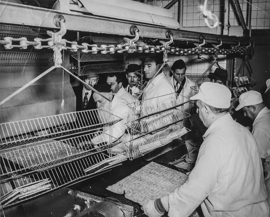 Read moreMen pose behind the cutting machine in this photo from the 1940s. The machine, which is attached to the sheeter, sliced perforated matzo into properly sized pieces. Those pieces were then separated by hand at the far end of the oven once the matzo had been baked. #