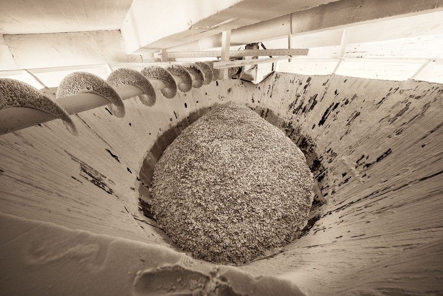 Read moreFreshly ground matzo farfel is pictured in 2015. To make farfel, matzo was dropped onto a conveyor belt, breaking it into pieces. The pieces were then broken down further by a large, coffin-sized shaking machine. When the pieces were small enough, they fell through tanks like the one seen here, to the floor below to be packaged. Pieces that were too small for farfel became matzo meal or cake meal. #