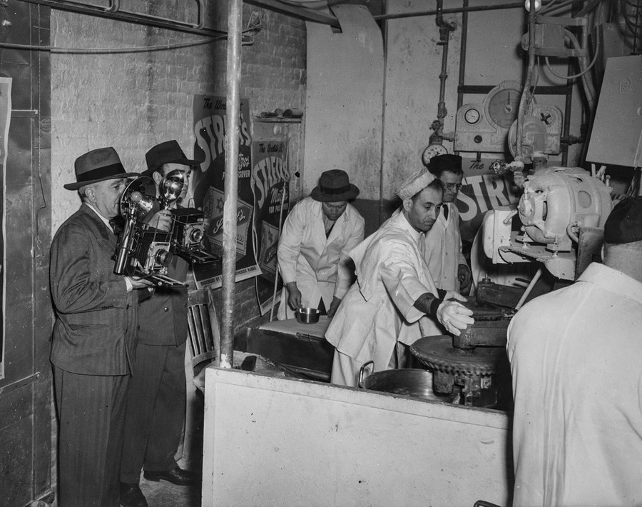 Read moreVisitors look on as a factory worker tests dough consistency after its been through the sheeting machine. From here, the dough will pass through additional rollers, the stippler, and the cutting machine, before making its way into the oven. In the background are poster sized Streit’s advertising, circa 1940s, which appeared regularly in The Jewish Daily Forward and other Jewish publications. #