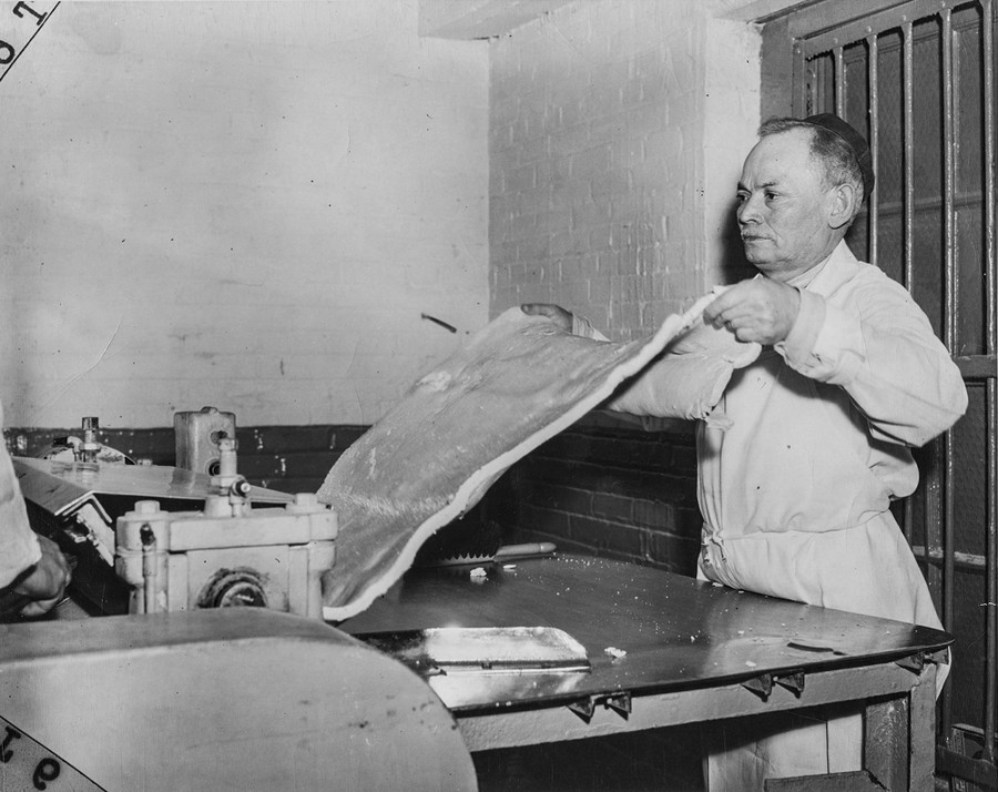 Read morePart of the matzo-making process that was unique to the Rivington Street factory was the sheeting process, in which the dough was repeatedly folded, creating air pockets that provided an extra crispness to the finished product. #