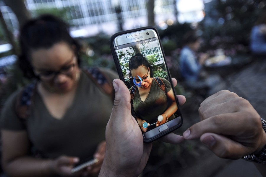Read moreA Pokémon appears on the screen next to a woman as a man plays the augmented reality mobile game Pokémon Go by Nintendo in Bryant Park in New York City, July 11, 2016. #