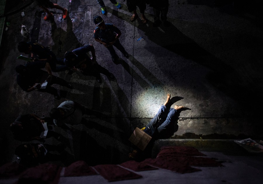 Read moreIn this picture taken on July 8, 2016, police officers investigate the dead body of an alleged drug dealer, his face covered with packing tape and a placard reading "I'm a pusher," on a street in Manila, Philippines. Philippine On July 1, President Rodrigo Duterte urged communist rebels to start killing drug traffickers, adding another layer to a controversial war on crime in which he has warned thousands will die. #