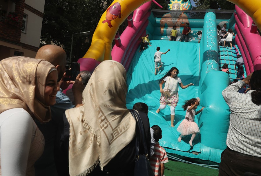 Read moreParents watch their children slide down an inflatable slide during a street fest in the immigrant-heavy Neukoelln district to celebrate the end of the Muslim month of Ramadan on July 5, 2016 in Berlin, Germany. Berlin is home to tens of thousands of Muslims, including Turks and Arabs, and the population has risen over the past year as large numbers of refugees from Iraq, Syria and Afghanistan have recieved asylum and are seeking to make Berlin their new home. #