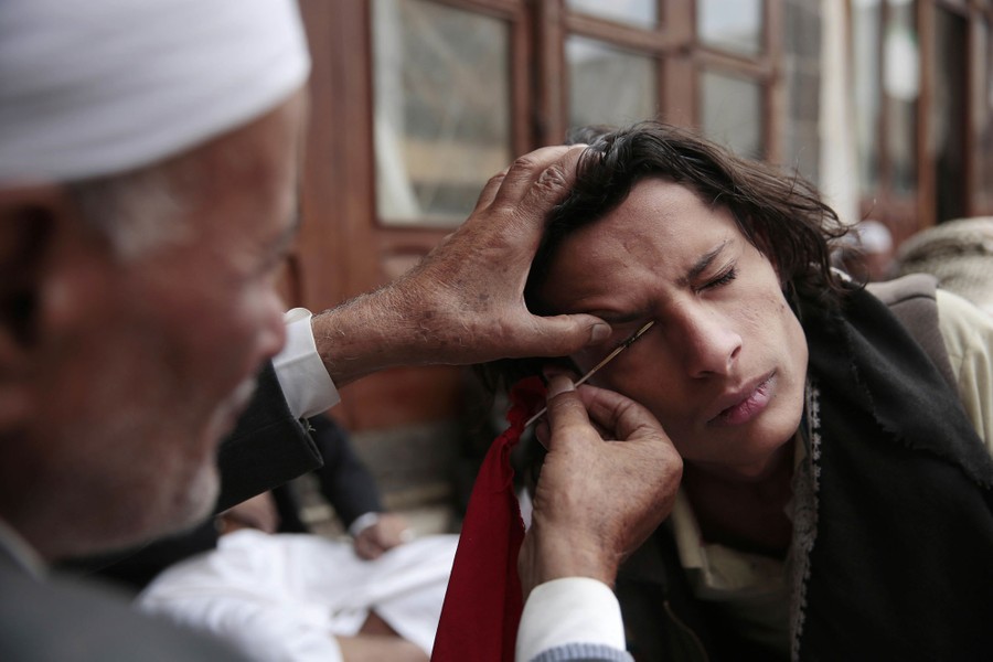 Read moreA man applies cosmetic kohl on another man's eyelid during the holy month of Ramadan in the grand mosque in the old city of Sanaa, Yemen, on June 23, 2016. Kohl is used in the Middle East as protection against eye ailments. #