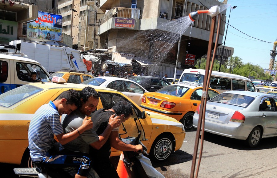 Read moreThree youths take advantage of a public shower to cool off from the summer heat during the holy, fasting month of Ramadan, when observant Muslims abstain from food and water during daylight hours, in Baghdad, Iraq, on June 11, 2016. #