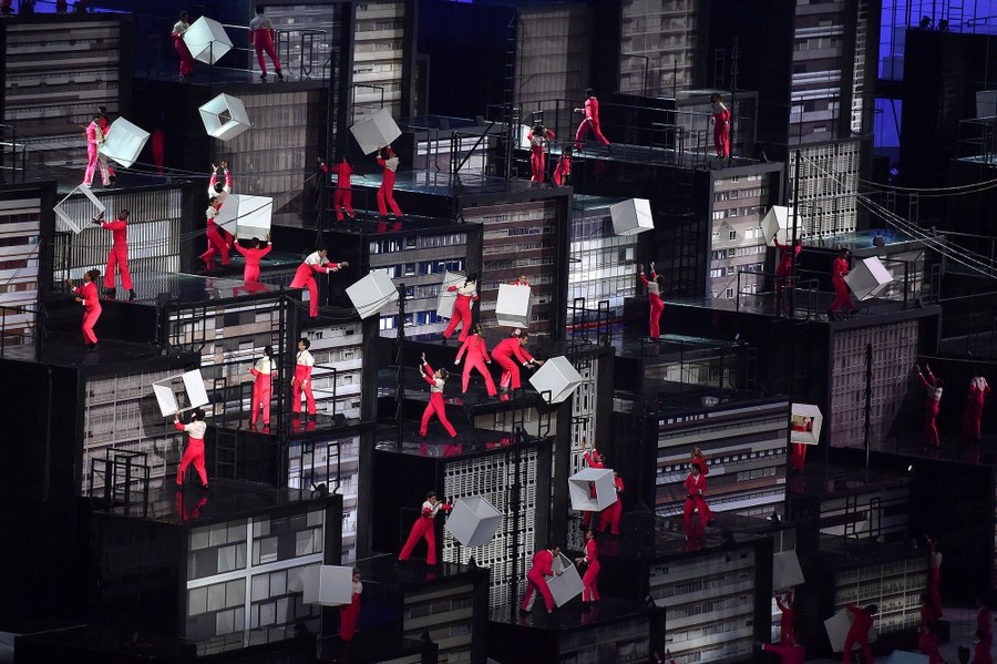 Read morePerformers scale mock buildings in Maracana Stadium during the Olympic Opening Ceremony. #