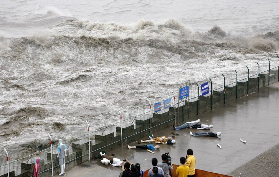 Read moreMannequins are toppled by the tide as a television crew films the scene along the banks of the Qiantang River in Hangzhou on September 25, 2010. The mannequins act as warning guides to alert tourists of the rising tides. #