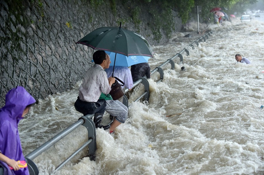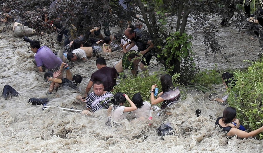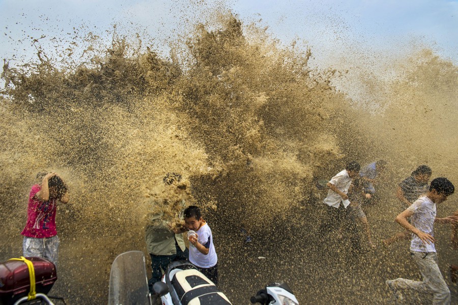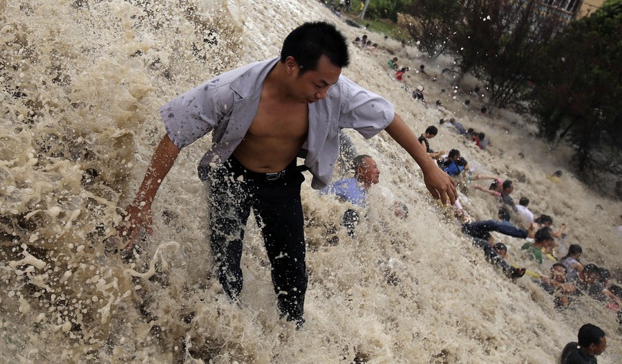 For hundreds of years, on the eighth month of the lunar calendar, people have gathered along the shores of China’s Qiantang River at the head of Hangzhou Bay to witness the waves of its famous bore tide. Higher-than-normal high tides push into the harbor, funneling into the river, causing a broad wave that can reach up to 30 feet high. If the waves surge over the banks, spectators can be swept up, pushed along walkways or down embankments. Below, I’ve gathered images from the past few years of the Qiantang bore tides.