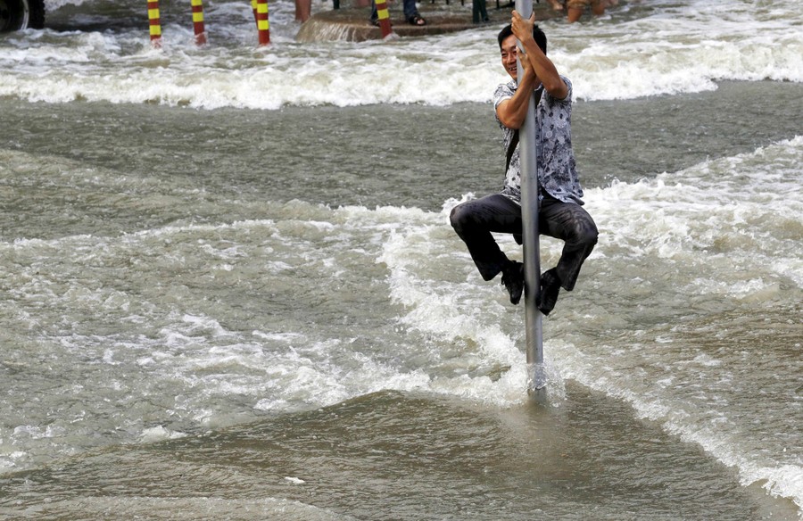 Read moreA paramilitary policeman holds onto a fence as tourists run from tidal waves increased under the influence of Typhoon Dujuan, on the banks of the Qiantang River on September 29, 2015. #