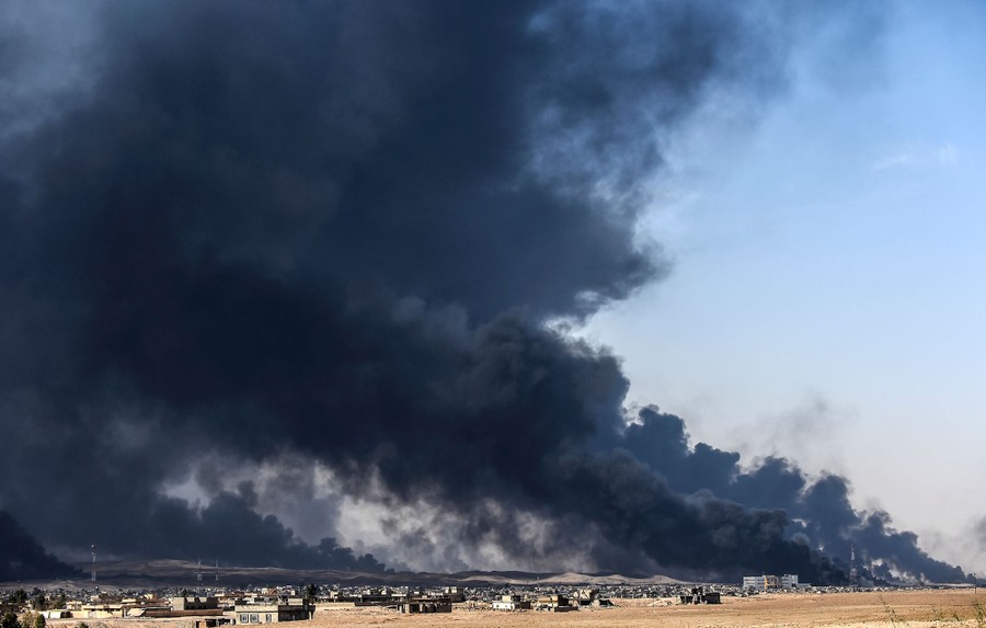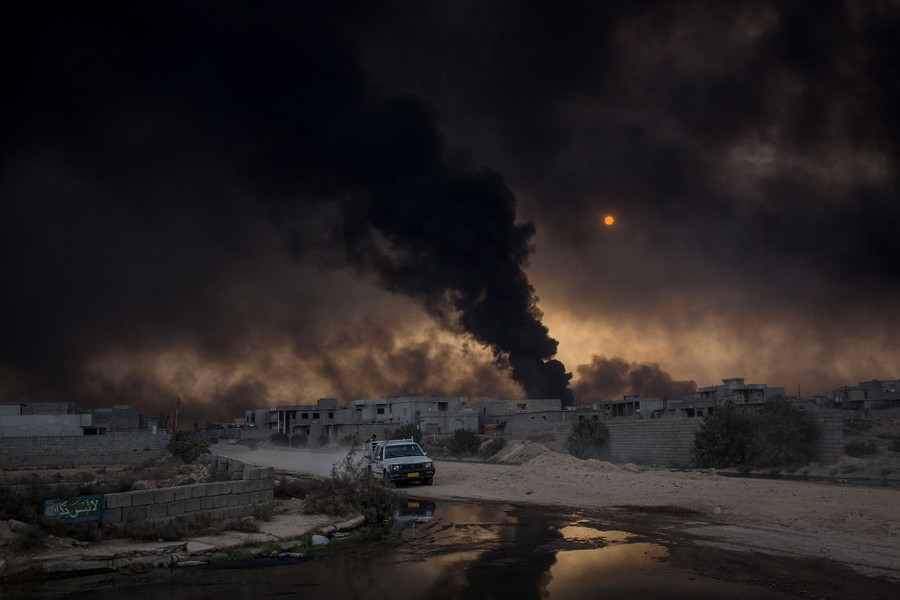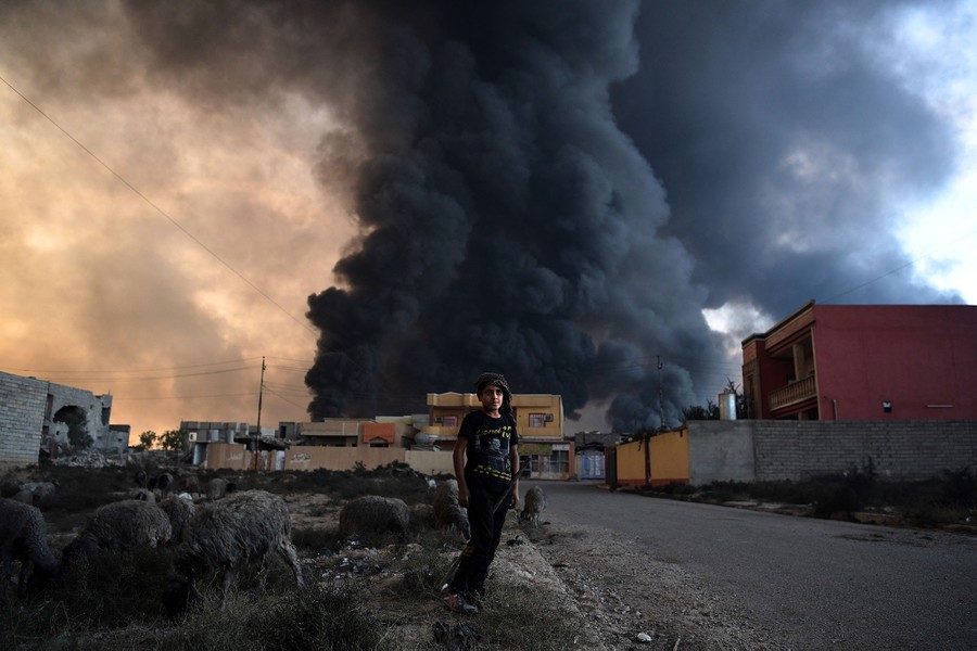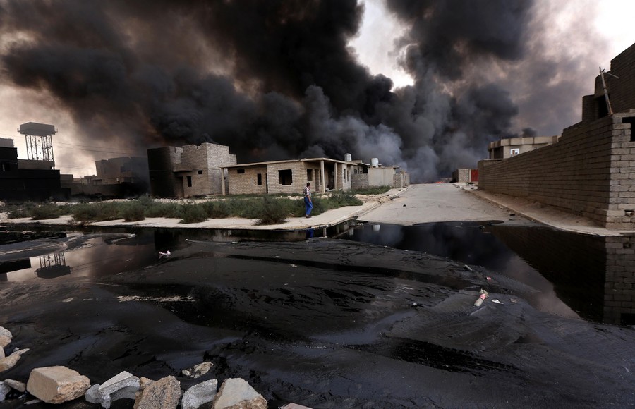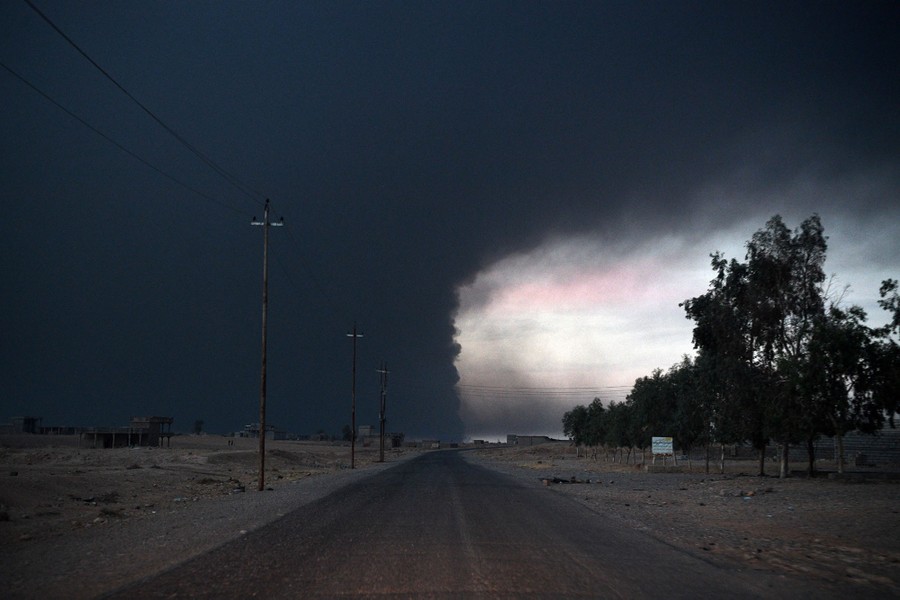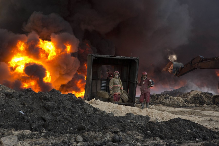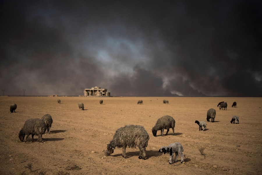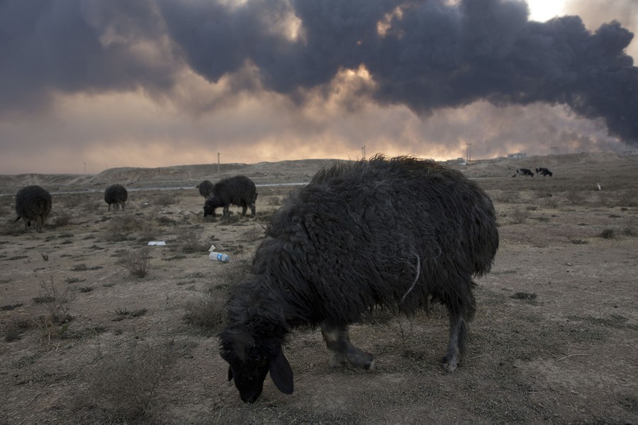 As Iraqi and Kurdish troops close in on the ISIS stronghold of Mosul in Iraq, militants fleeing the region have been sabotaging oil-producing facilities and setting oil wells ablaze, blackening the skies with oily soot for miles. Residents trapped in the area, or attempting to return to their homes, are experiencing health problems related to the smoke, and shepherds are unable to sell the wool of their blackened sheep. As troops are able to stabilize some areas, firefighters attempt to tame the fires before they spread to already-damaged villages nearby.