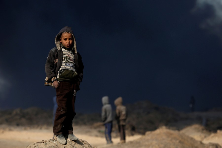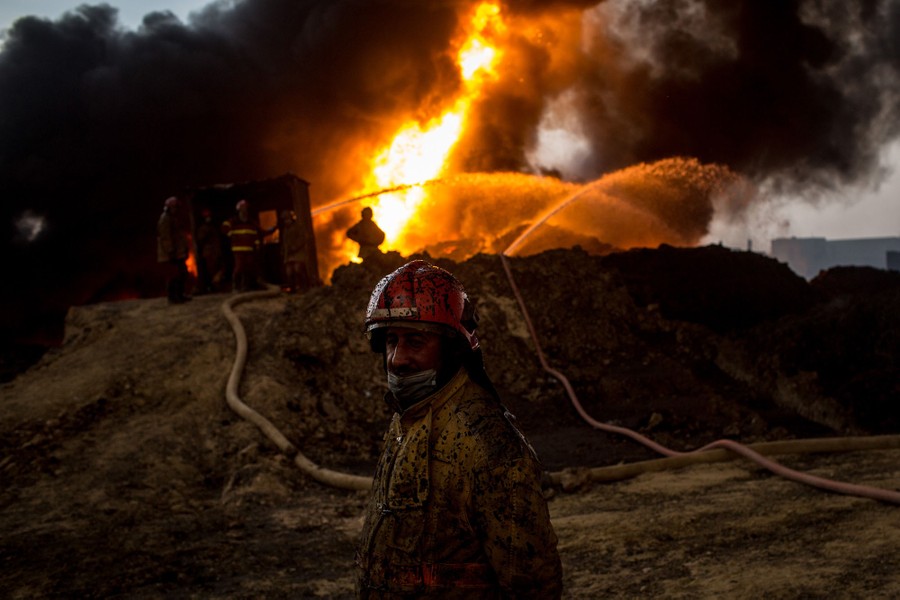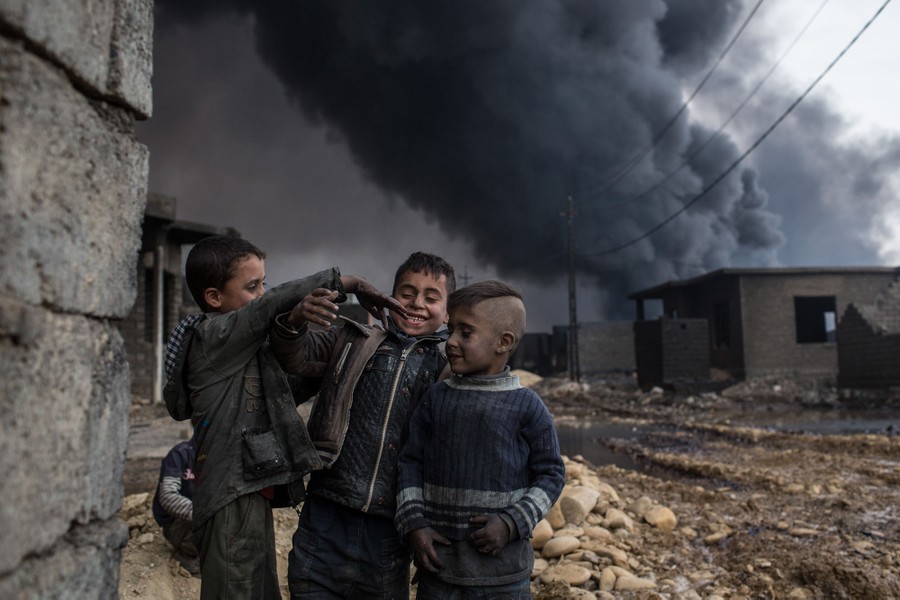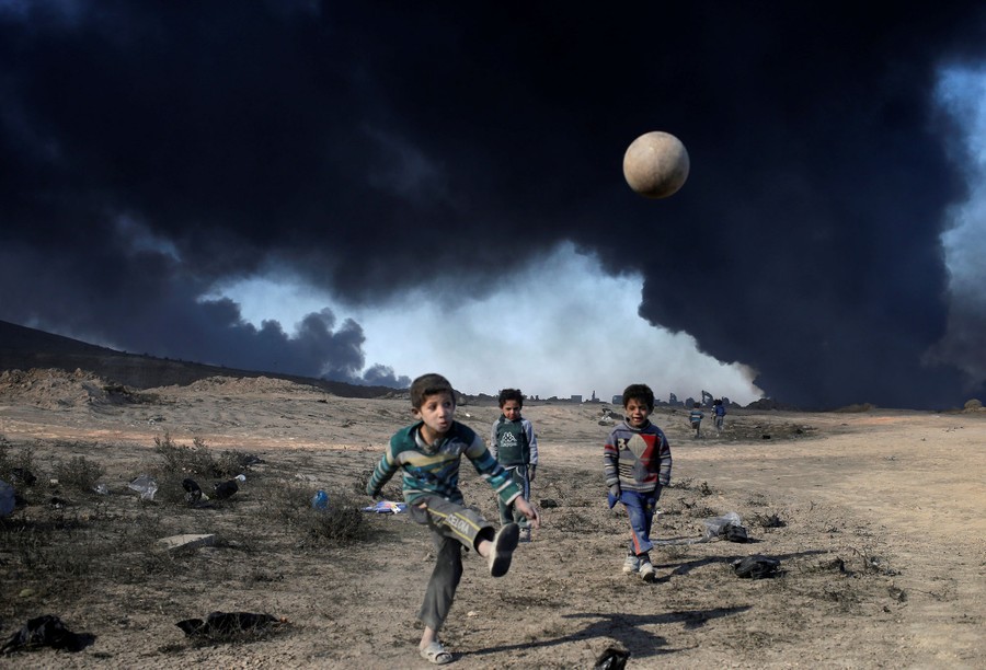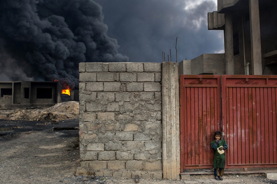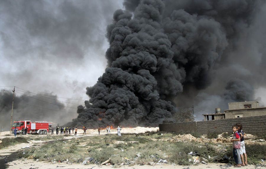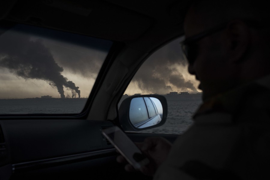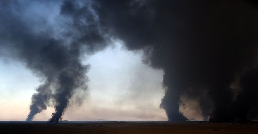 As Iraqi and Kurdish troops close in on the ISIS stronghold of Mosul in Iraq, militants fleeing the region have been sabotaging oil-producing facilities and setting oil wells ablaze, blackening the skies with oily soot for miles. Residents trapped in the area, or attempting to return to their homes, are experiencing health problems related to the smoke, and shepherds are unable to sell the wool of their blackened sheep. As troops are able to stabilize some areas, firefighters attempt to tame the fires before they spread to already-damaged villages nearby.