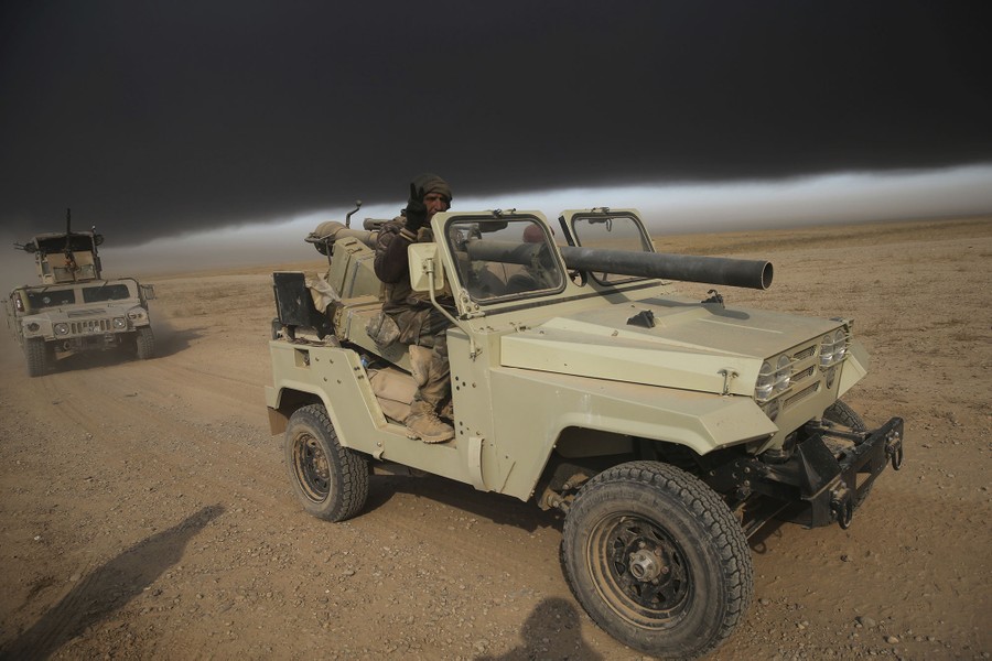 Read moreIraqi army humvees drive on the desert on their way to support their comrade, as black smoke covers the sky during their battle against ISIS, in Haj Ali front line village, southern Mosul, on November 29, 2016. #