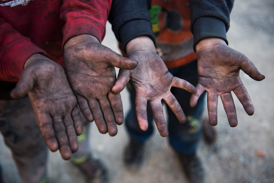 Read moreChildren living near burning oil wells set ablaze by retreating ISIS jihadists display their blackened hands in the town of Qayyarah on November 20, 2016. Locals told AFP that they face a range of health issues including breathing difficulties, and shepherds said they could not sell their livestock as the sheep's fleece was blackened by smoke. #