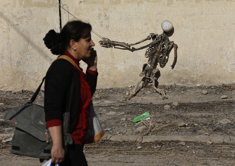 Read moreAn Iraqi Christian woman talks on her mobile phone as she passes a model of a skeleton apparently set up by ISIS fighters during their occupation of Keramlis village, on November 13, 2016. #