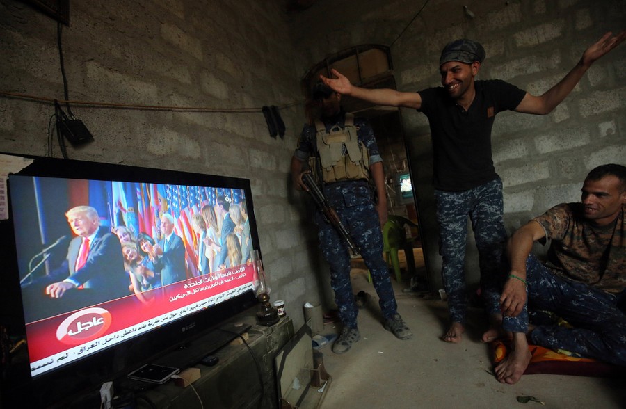 Read moreMembers of Iraqi forces react as they watch Donald Trump giving a speech after he won the US president elections in the village of Arbid on the southern outskirts of Mosul on November 9, 2016, as they rest in a house during the ongoing military operation to retake Mosul from ISIS. Iraqi Prime Minister Haider al-Abadi congratulated Donald Trump on his election as president and said he hoped for continued US and international support in the war against jihadists. #