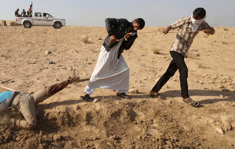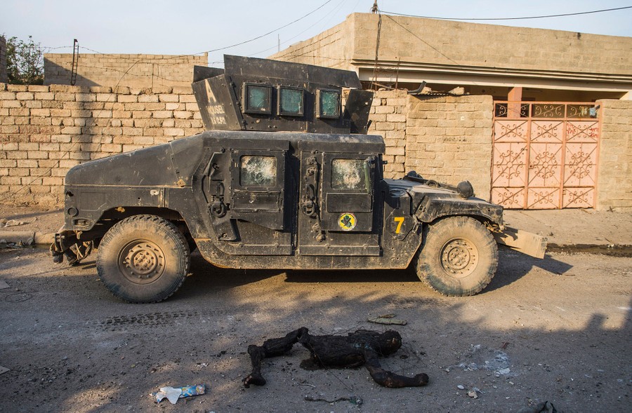 Click to view imageRead moreA Humvee military vehicle from the Iraqi Special Forces 2nd division drives past the charred remains of an ISIS fighter in Mosul's Arbagiah neighborhood on November 13, 2016. #