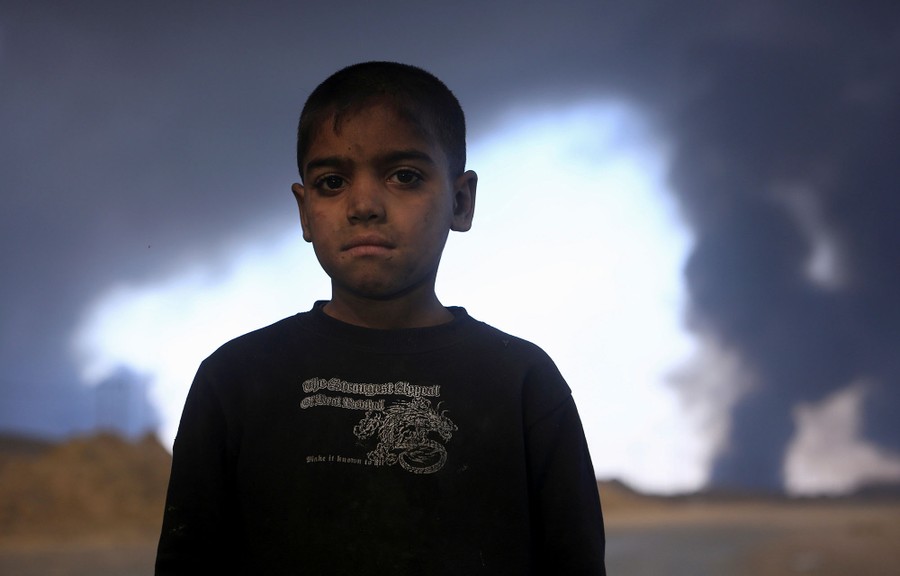 Read moreA boy poses for the camera as smoke rises from oil wells, set ablaze by ISIS militants before the militants fled the oil-producing region of Qayyara, Iraq, on November 12, 2016. #