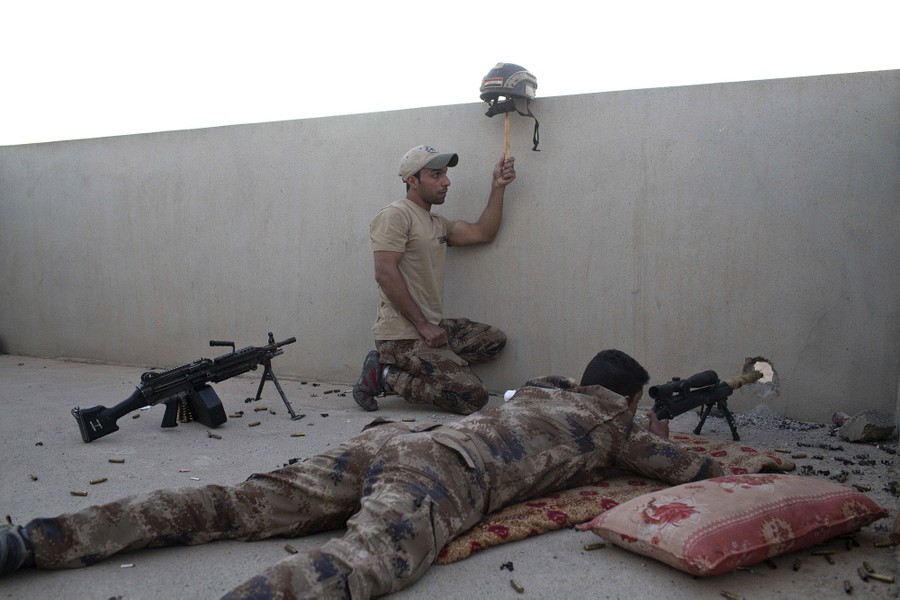 Read moreAn Iraqi special forces soldier puts up a helmet as a decoy as a sniper gets ready to fire on ISIS positions in Gogjali, on the eastern edges of Mosul, Iraq, on November 3, 2016. #