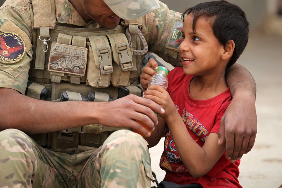 Read moreA member of Iraqi forces gives juice to a child in the village of Umm Mahahir, south of Mosul, on October 28, 2016 after troops recaptured it from ISIS jihadists as part of their operation to retake the main hub city of Mosul. #