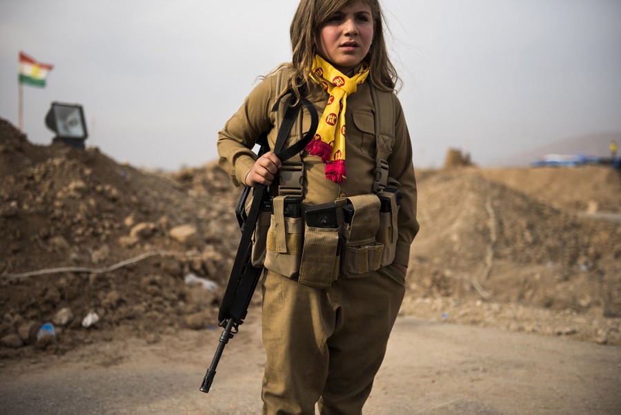 Read moreA Kurdish girl wears her relative's assault rifle and ammunition belt as she waits at the Iraqi Kurdish Shaqouli checkpoint, some 35 kilometers east of Mosul, on November 10, 2016. Since the start of the Mosul offensive the Kurds have moved their border some 10 km closer to Iraq's second city, marking it out with a line in the sand. #