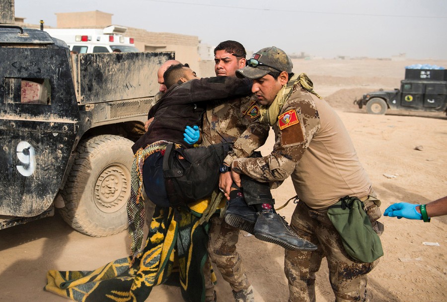 Read moreFrontline medics help carry an Iraqi soldier hit by sniper fire at an Iraqi Special Forces 2nd division outdoor field clinic in the Samah neighborhood of Mosul on November 15, 2016. #