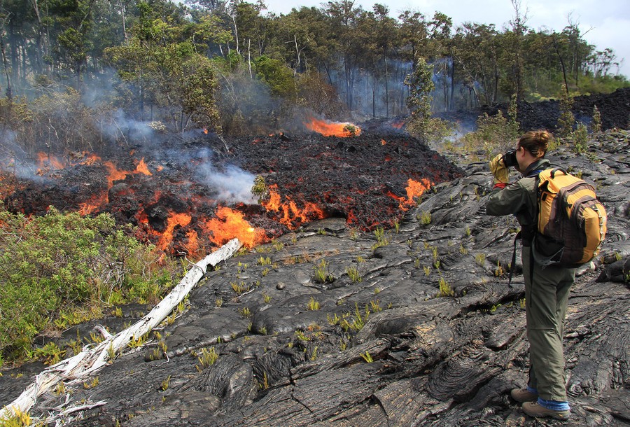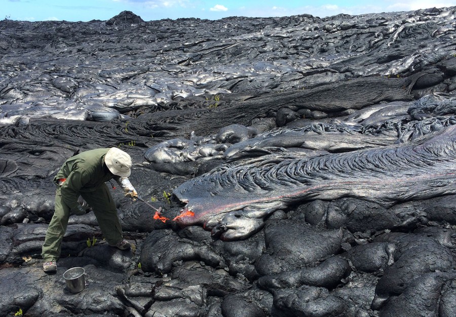 Read moreJune 23, 2016. A Hawaiian Volcano Observatory (HVO) geologist collects a fresh lava sample from Kilauea volcano for chemical analysis. The lobe being sampled was typical of the many scattered pāhoehoe breakouts along the flow margin. #