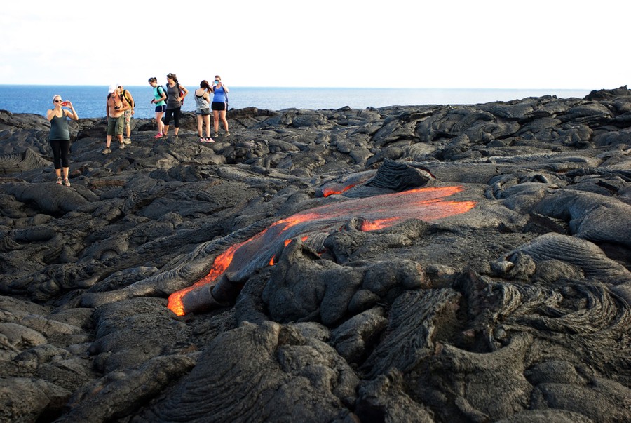 Read moreVisitors look at lava from Kilauea as it flows toward the ocean in Volcanoes National Park near Kalapana, Hawaii, on August 8, 2016. The current lava flow erupted from a vent on the volcano in May and made its way to the sea in late July. Visitors can hike about 10 miles round trip to see the lava, or take a boat or helicopter tour to see the flow. #