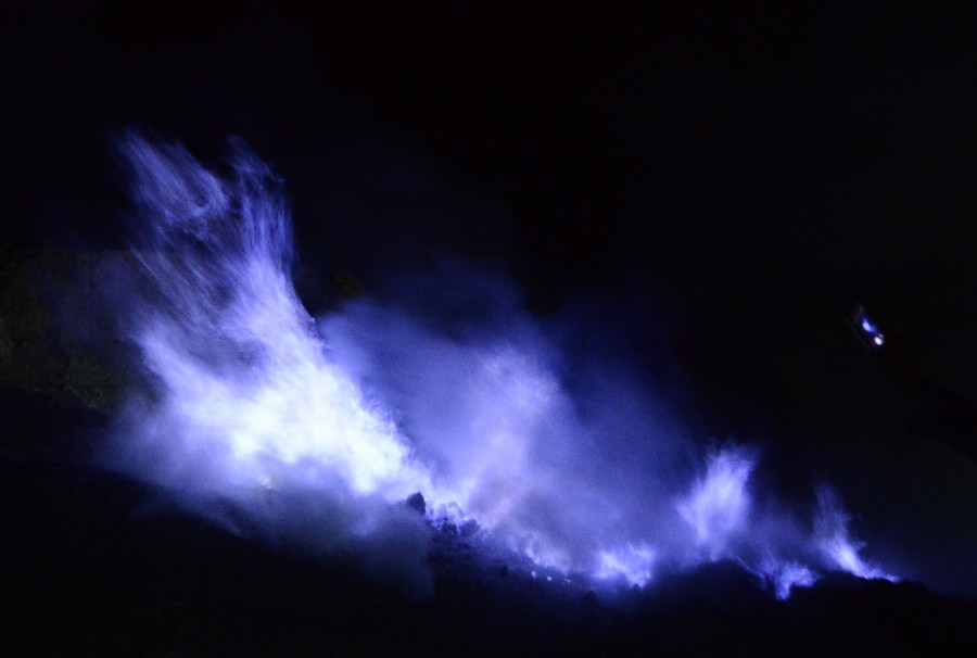 Read moreBrilliant blue flames light up the night sky above Kawah Ijen on June 15, 2016, casting an eerie electric glow as they flow down the sides of the active volcano. Hot sulphuric gases -- escaping at high pressure through cracks in this legendary mountain -- ignite upon contact with air, burning a fantastic, iridescent blue. #