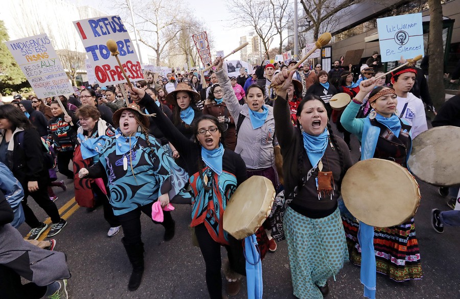 Read moreIn Seattle, Washington, native American women singers and drummers lead a women's march of thousands as it arrives at the Seattle Center, on January 21, 2017. Women across the Pacific Northwest marched in solidarity with the Women's March on Washington and to send a message in support of women's rights and other causes. #
