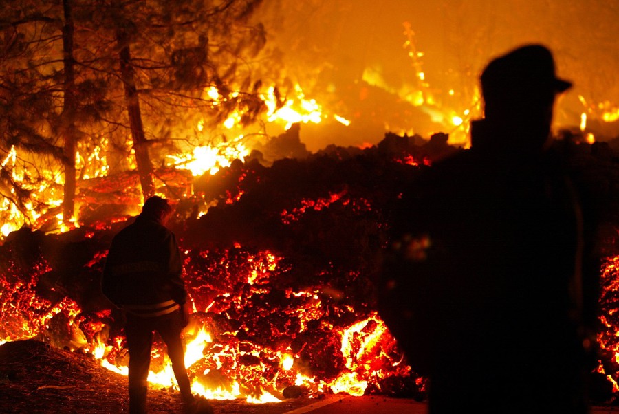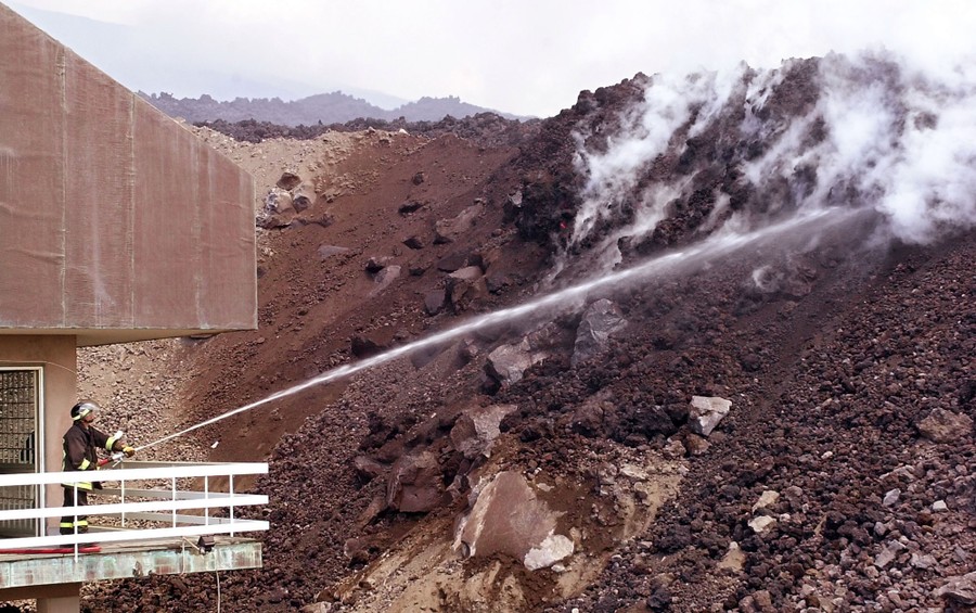 Read moreFireman monitor lava as Mount Etna spews out fresh lava on October 27, 2002. Rivers of boiling lava poured down Mount Etna, engulfing small buildings and threatening a mountain lodge after a series of earthquakes awakened the volcano. #