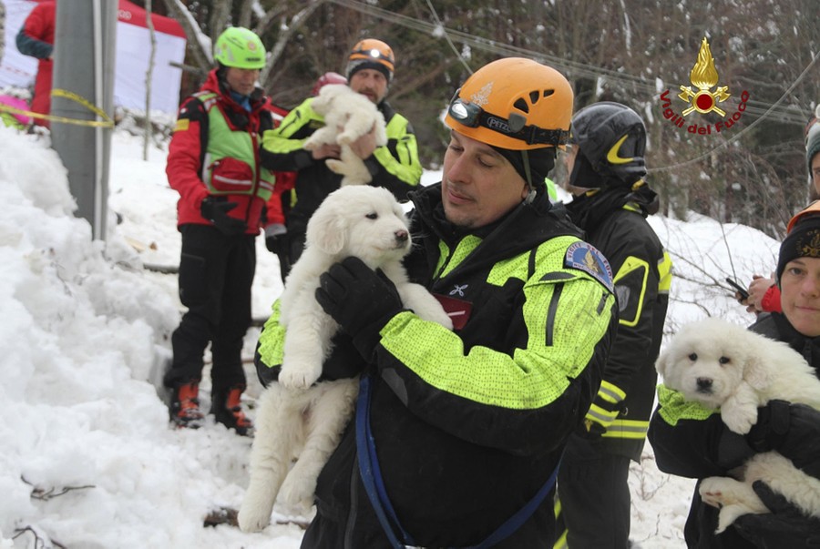 Read moreFirefighters hold three puppies that were found alive in the rubble of the avalanche-hit Hotel Rigopiano, near Farindola, central Italy, on January 22, 2017. Emergency crews digging into the hotel were cheered by the discovery of three puppies who had survived for days under tons of snow. #