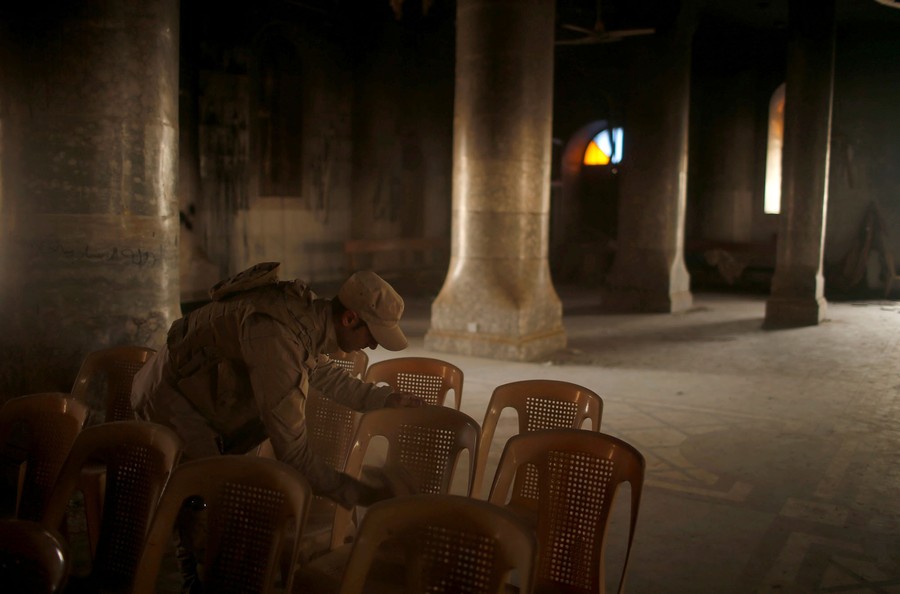Read moreAn Iraqi soldier cleans chairs as others attend the first Palm Sunday procession in the burnt out main church of the Christian city of Qaraqosh since Iraqi forces retook it, on April 9, 2017. #