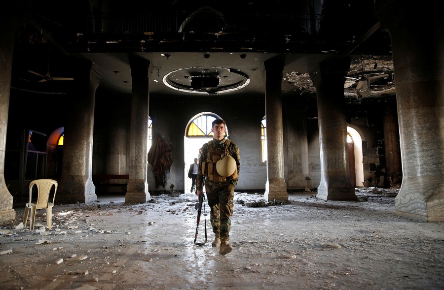 Read moreA fighter from the NPU (Nineveh Plain Protection Units) walks through a destroyed church on November 8, 2016 in Qaraqosh, Iraq. The NPU is a military organization made up of Assyrian Christians and was formed in late 2014 to defend against ISIS. #