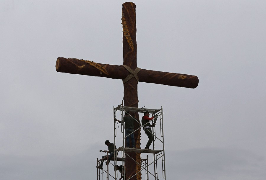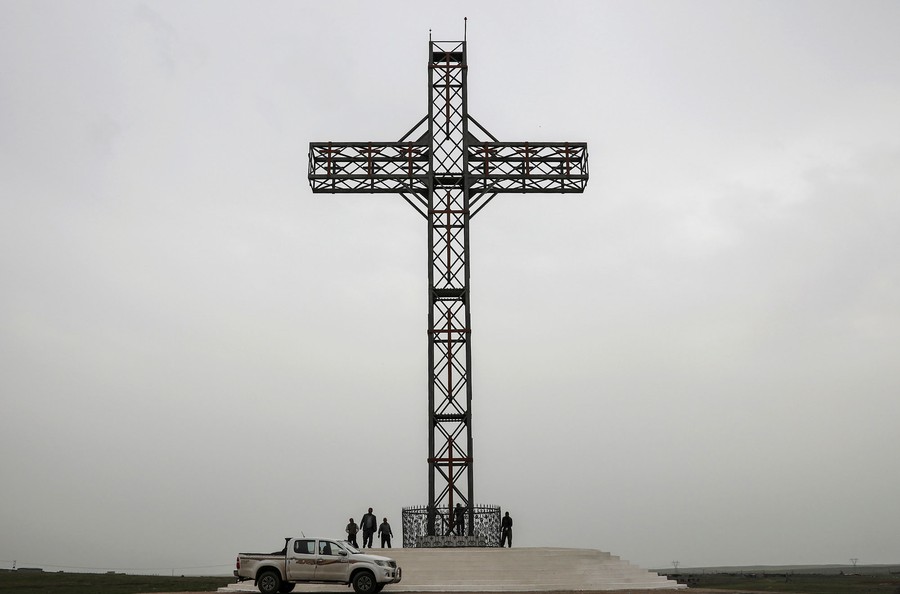 Read moreVolunteers from the Iraqi town of Qaraqosh build a giant cross on the main road, as they try to return to normal life after ISIS jihadists were expelled in October of 2016. #