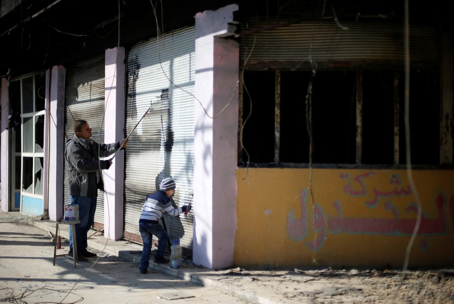 Read moreAn Iraqi Christian volunteer and his son paint over signs and writings by ISIS militants in Qaraqosh on February 7, 2017, after the militants were driven out by the government army. #