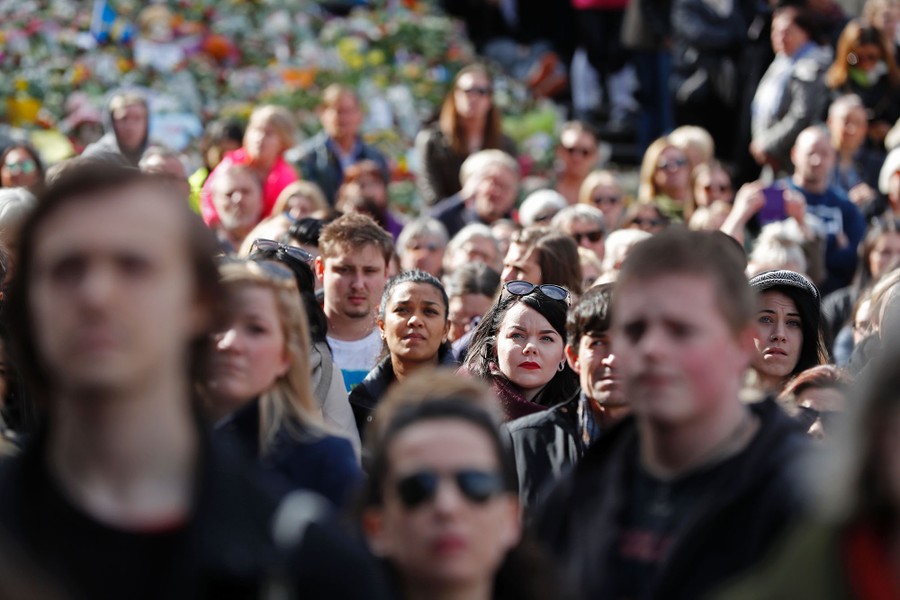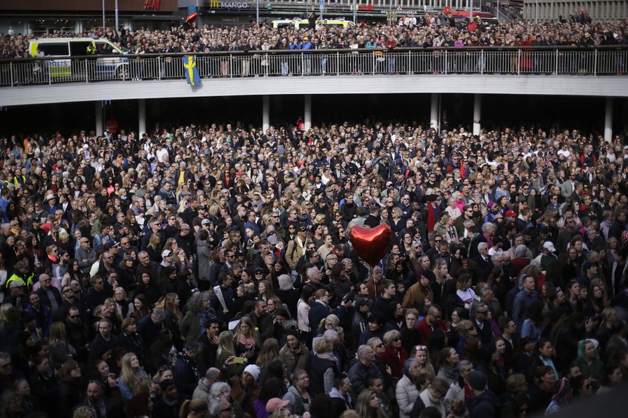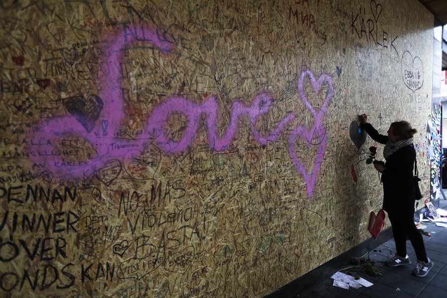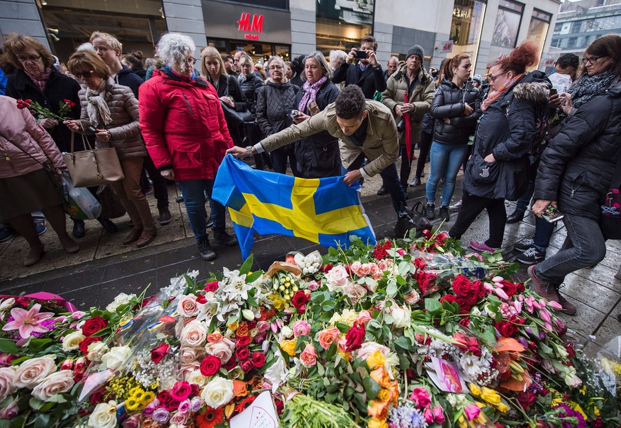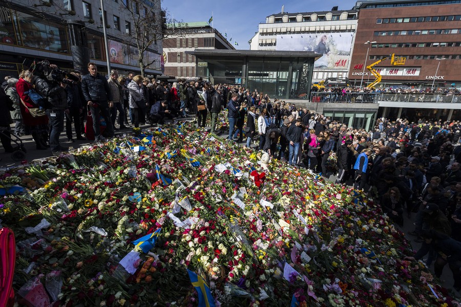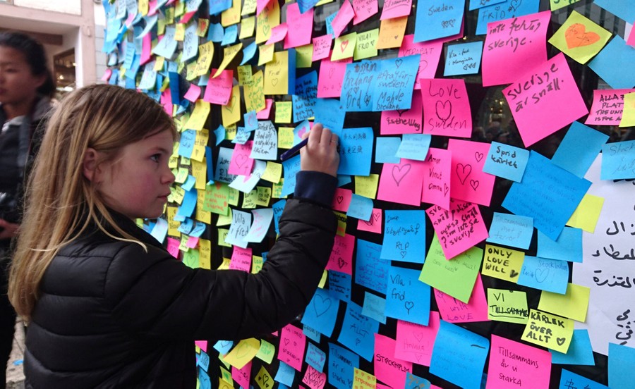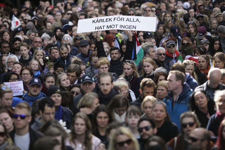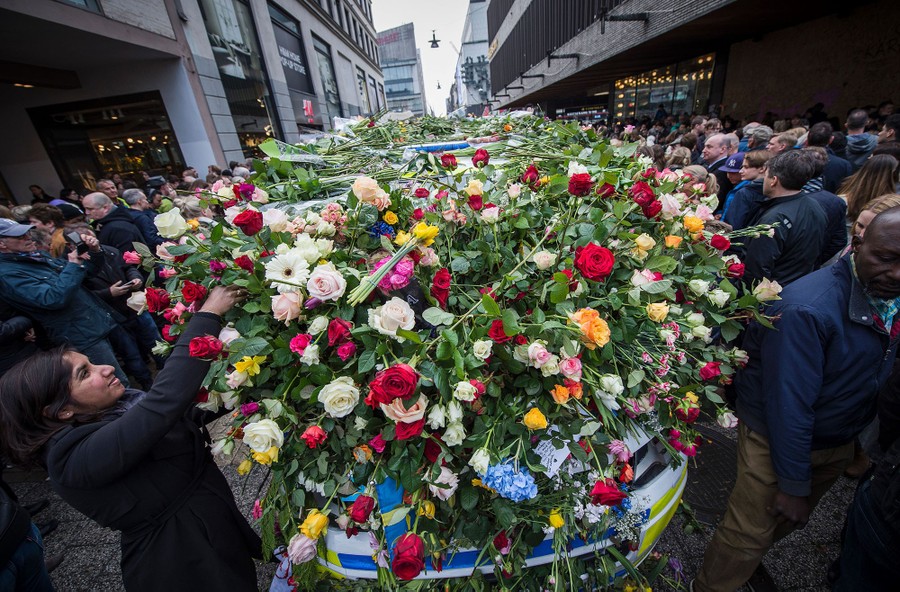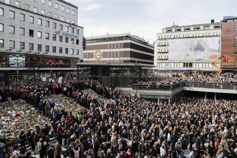 Over the weekend memorials and ceremonies were held in Stockholm, Sweden, to remember the victims of Friday’s attack, and to stand together in defiance of terrorism. Four people were killed and fifteen injured when a hijacked truck was driven into a crowd on a busy pedestrian street on April 7, 2017. An Uzbek man, reportedly an asylum-seeker who had been rejected, was arrested and is being held on terrorism charges. Thousands of Swedes attended a “Lovefest” in central Stockholm on Sunday, and the shopping district filled with pedestrians once more, as soon as it was re-opened.