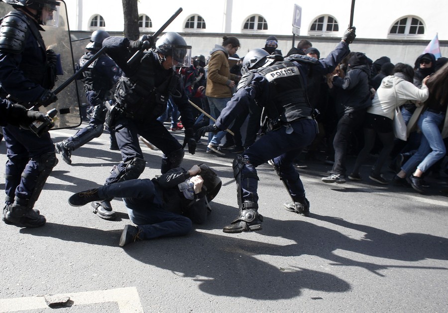 Read moreFrench CRS anti-riot police officers are engulfed in flames as they face protesters during a march for the annual May Day workers' rally in Paris on May 1, 2017. The march was disrupted as scores of hooded youths threw firebombs at riot police in full gear, who responded with tear gas and truncheons. #