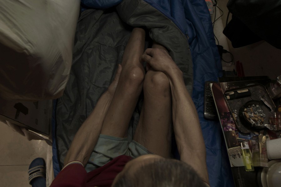 Read moreWong Tat-ming, 63, sits in his coffin home, crammed with all his meager possessions, including a sleeping bag, small color TV and electric fan, on March 28, 2017. He and another elderly resident complained to a visiting social worker about bedbugs and cockroaches. #