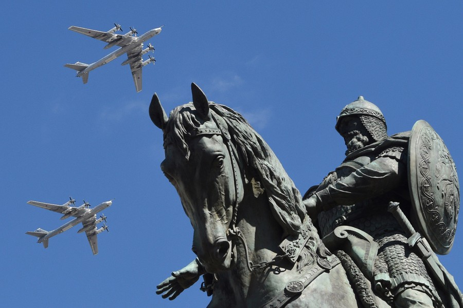 Read moreRussian Tu-95MS strategic bombers fly over the equestrian statue of Russia's Prince Yuri Dolgoruky during the Victory Day military parade general rehearsal in Moscow on May 7, 2017. #