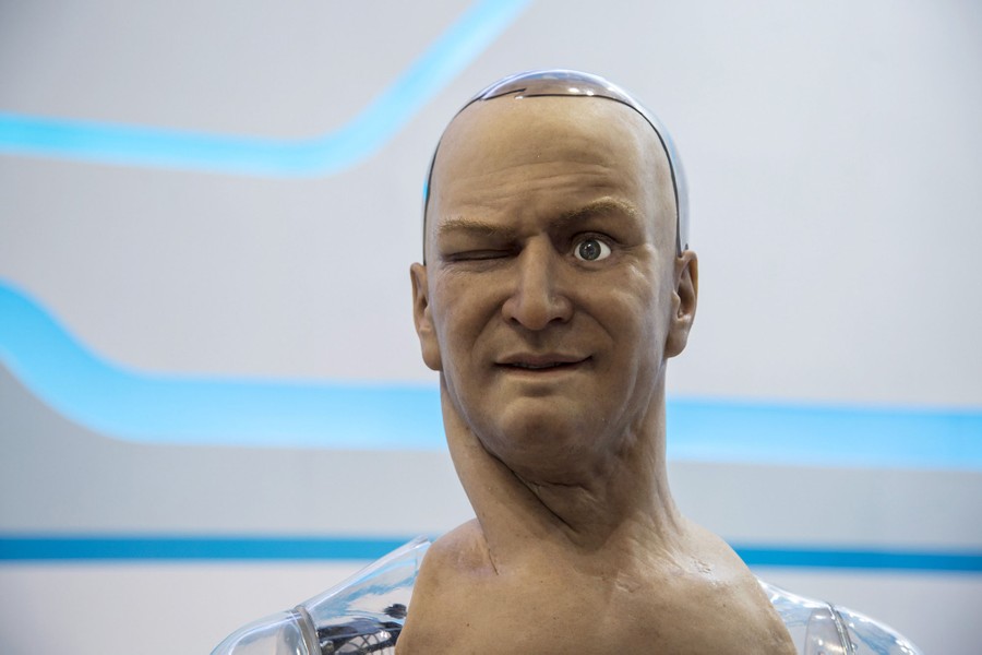 Read moreA humanoid robot named Han developed by Hanson Robotics reacts as the controller commands it via a mobile phone to make a facial expression during the Global Sources spring electronics show in Hong Kong April 18, 2015. According to Hanson Robotics the robot's skin is made out of a material called Frubber, an elastic polymer that mimics the human skin, and installed with about 40 motors on its face which help create various expressions. Han can answer simple questions and staff said it can be used in the field of customer service. #